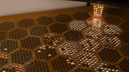 The piece is a conventional L-shaped desk, but with a honeycomb motif inlaid into the surface itself. [Full Stack Woodworking] started by iterating on various designs with stacked hexagons made out of laser cut plywood and Perspex, filled with epoxy. Producing enough hexagons to populate the entire desk was no mean feat, requiring a great deal of cutting, staining, and gluing—and all this before the electronics even got involved! Naturally, each cell has a custom built PCB covered in addressable LEDs, and they’re linked with smaller linear PCBs which create “paths” for bees to move between cells.