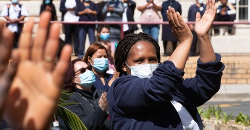 Health care workers applaud outside a hospital in September 2021 in Cape Town. | Rodger Bosch/AFP via Getty Images