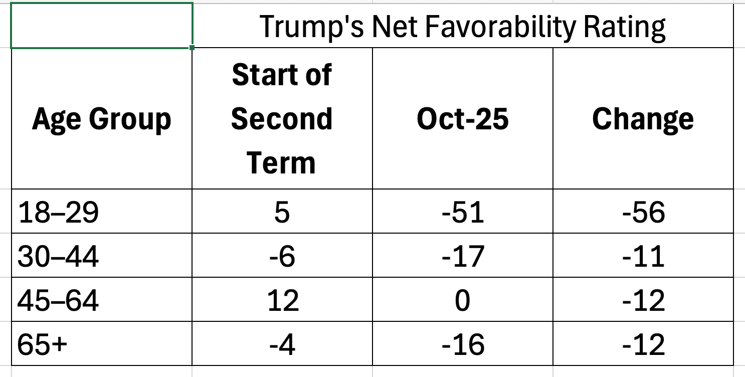 It is in that spirit that I highlight the most recent Economist/YouGov poll regarding Trump’s net favorability rating trend in his second term. Trump has suffered double-digit declines in his net favorability among every age cohort, as shown by the following chart: