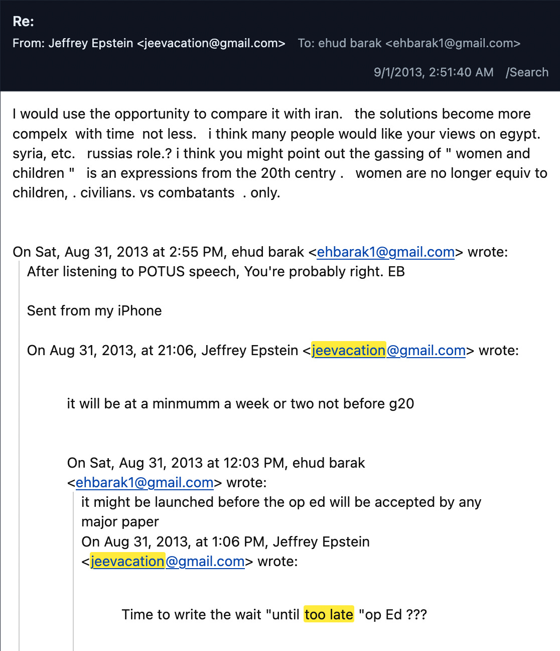 Epstein emailed Barak as soon as news of Obama’s speech broke, on August 31, to propose publishing his shelved Syria narrative: “Time to write the wait ‘until too late’ op Ed ???” Barak responded, solemnly: “[U.S. strikes] might be launched before the op ed will be accepted by any major paper.” Epstein disagreed, suggesting any action would likely occur after the G20 summit on September 5, and Congress’s return the week after: “it will be at minmumm a week or two not before g20.” An hour later, Barak agreed: “After listening to POTUS speech, You’re probably right.”