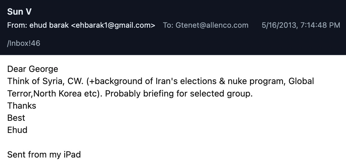 Upon his return from Moscow, Barak contacted George Tenet, former director of the CIA, to pitch a talk he (Barak) could give at Allen & Company’s Sun Valley event in July—a “summer camp” for billionaires and elite politicians to convene and negotiate deals. The topic? “Think of Syria, CW. (+background of Iran’s elections & nuke program, Global Terror, North Korea etc). Probably briefing for selected group.” Barak was not recorded on the guest list.
