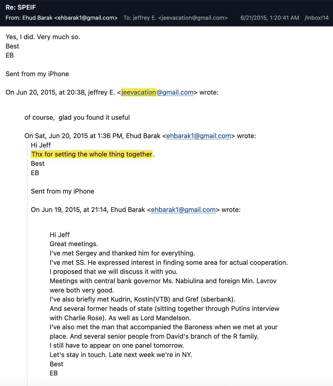 Barak once again leaned on Epstein to get a line to Moscow before the Iran nuclear deal was finalized. He visited New York City from April 21 to April 24, where received Epstein’s help to once again attend the St. Petersburg International Economic Forum that summer. Epstein connected Barak to Sergey Belyakov, a former Russian economic minister with ties to Russian intelligence, to help Barak get an invitation and set up meetings with senior Russian officials. Epstein also directed Barak to convey that senior Russian officials including Putin should also contact Epstein directly for meetings.