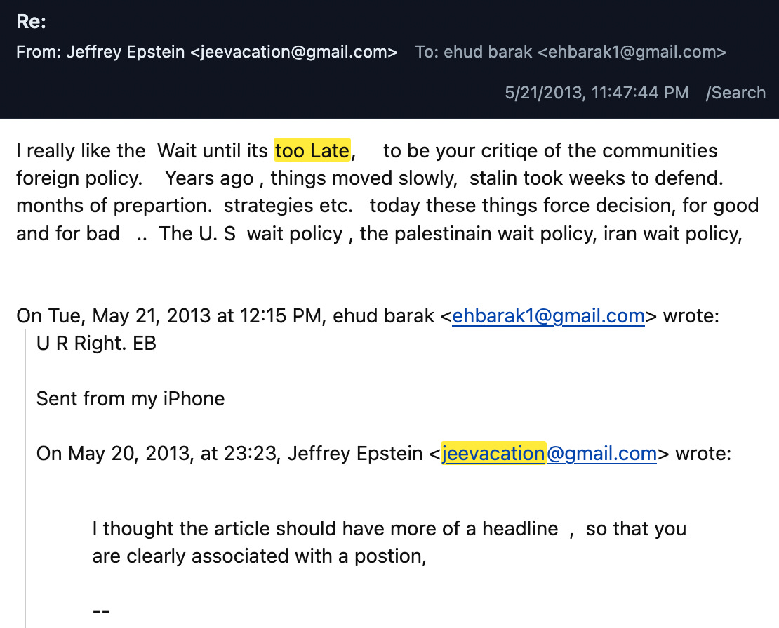 In the early hours of May 9, 2013, former Israeli prime minister Ehud Barak emailed his close friend Jeffrey Epstein with an urgent message. “R U awake? if yes, pl call,” Barak wrote Epstein, at 1 a.m. in New York. Shortly after they spoke, Barak emailed again to ask Epstein to keep their conversation private: “jeff pl don’t share the info with any of our friends.”