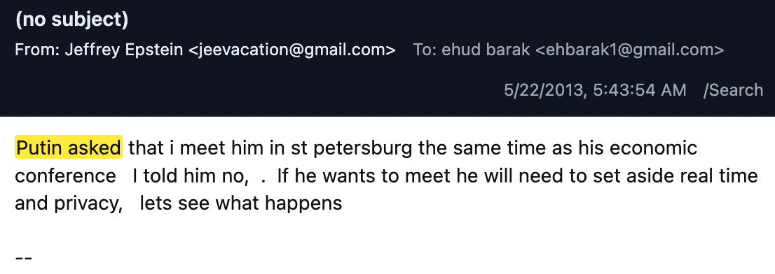 On May 22, 2013, Epstein informed Barak he’d received—and rejected—an invitation to meet with Putin at the St. Petersburg International Economic Forum the next month: “Putin asked that i meet him in st petersburg the same time as his economic conference…i told him no, . If he wants to meet he will need to set aside real time and privacy.”