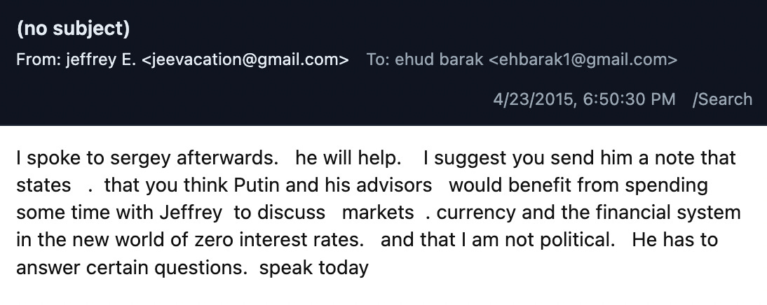 Epstein wrote on April 23, 2015: “I spoke to sergey…he will help. I suggest you send him a note that states that you think Putin and his advisors would benefit from spending some time with Jeffrey to discuss markets currency and the financial system in the new world of zero interest rates. and that I am not political. He has to answer certain questions.” Epstein’s request to again add Barak came as the Israeli government was attempting to manage an increasingly delicate balancing act in its ties with Moscow and Washington. He added: “when you receive the list [of Russians] from sergey, he asked that we prioritze who we would find most interesting.”