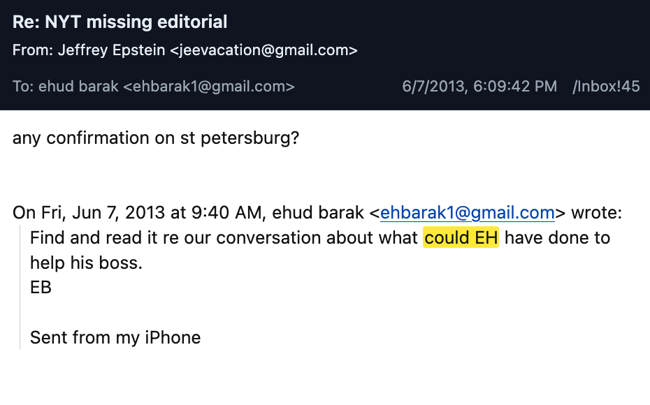 The two men recognized the Snowden leaks could undermine the Obama administration’s leverage in negotiations with Putin. Barak asked Epstein to read the article, in which the NYT editors claimed the president had “lost all credibility” by abusing his executive powers. Barak wrote, “Find and read it re our conversation about what could EH [attorney general Eric Holder] have done to help his boss.” Epstein replied: “any confirmation on st petersburg?”