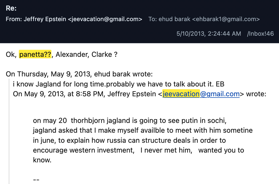 A few hours after Barak informed Epstein of his Moscow plans, Epstein shared some intelligence about one of Putin’s interlocutors, the head of the Council of Europe: “on may 20 [thorbjorn] jagland is going to see putin in sochi, jagland asked that I make myself availble to meet with him sometine in june, to explain how russia can structure deals in order to encourage western investment, I never met him, wanted you to know.” Barak, who was working closely with Epstein to cut deals in the Eurasian energy sector, wrote back: “i know Jagland for long time. probably we have to talk about it.”