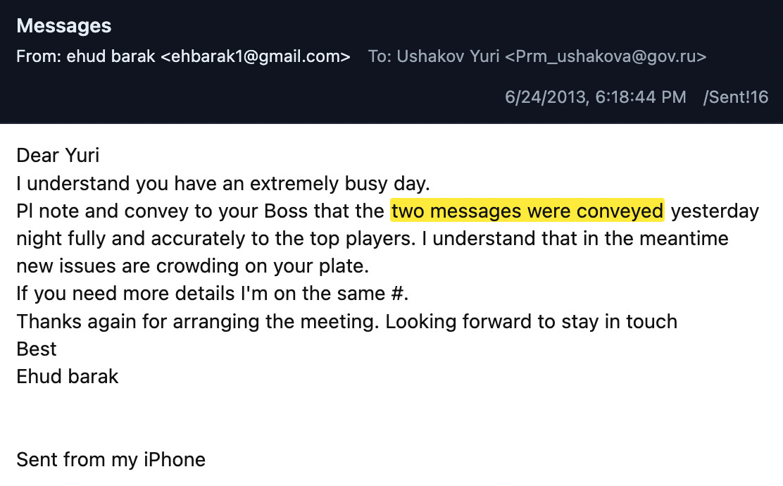 On June 24, Barak sent an email back to Ushakov, reporting that the backchannel communication was successful. Barak confirmed that messages from Putin had been transmitted to relevant parties: “[Please] note and convey to your Boss that the two messages were conveyed yesterday night fully and accurately to the top players.” Barak’s email did not specify the identities of the players or the content of the messages.