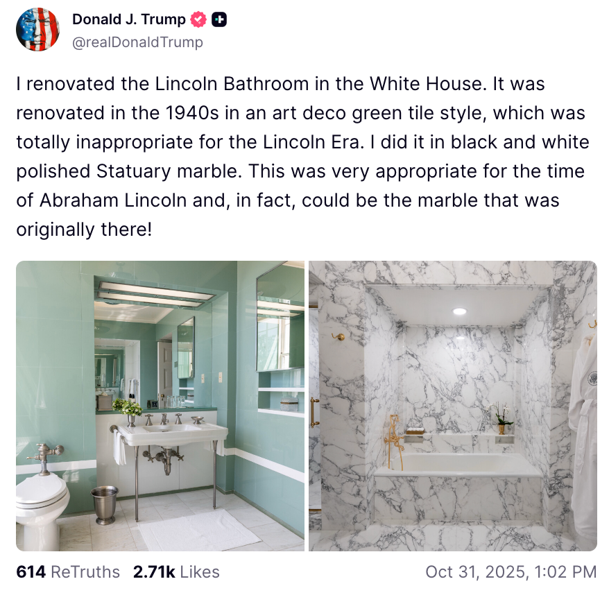 So perhaps Trump decking out a White House bathroom in marble and gold just as millions of Americans are poised to lose SNAP benefits due to a government shutdown actually wouldn’t go over well with “Honest Abe”? But at least we know Mary Lincoln would have loved it!
