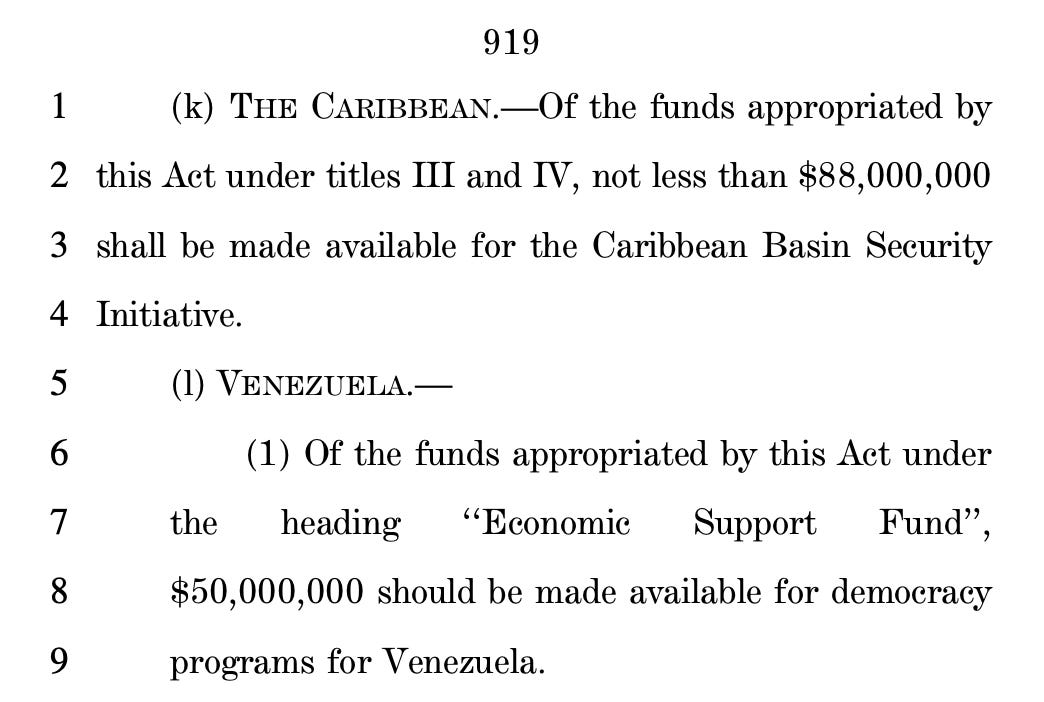 Text of the appropriations bill that outlines how funds are allocated for “democracy programs for Venezuela.