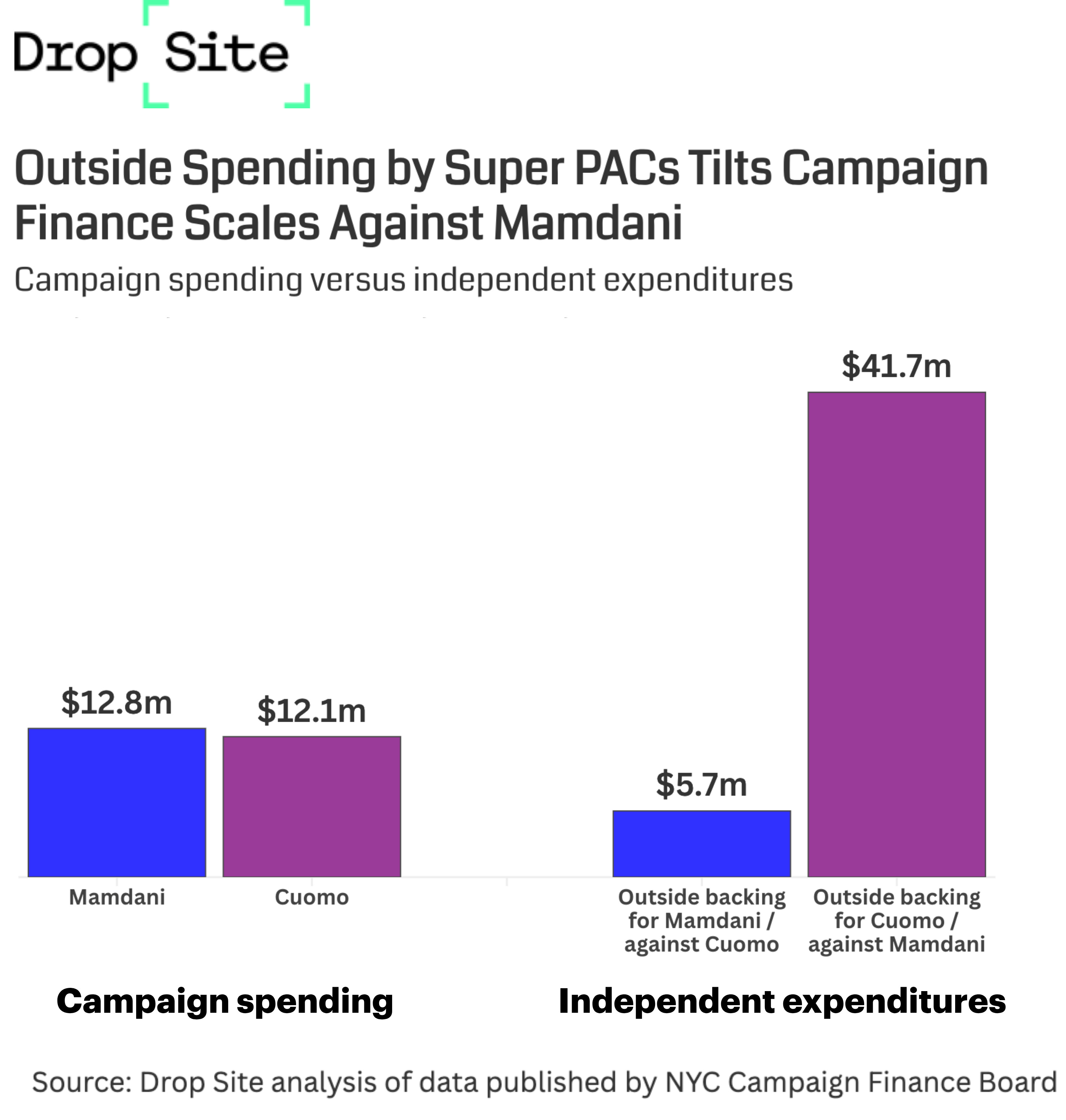 Drop Site contributor Meghnad Bose, meanwhile, reports a piece with journalist Biplob Das on how billionaire donors are making an expensive eleventh-hour effort aiming to prevent Zohran Mamdani from becoming the next mayor of New York City. In the final days, the approach of the Cuomo campaign’s backers has been unconventional in some ways: a major pro-Cuomo super PAC, funded by billionaire hedge fund manager Bill Ackman, is spending hundreds of thousands of dollars calling Cuomo “flawed,” and amplifying a tweet that starts by saying “Cuomo murdered my husband,” while asking New Yorkers to vote for him despite his drawbacks.A data analysis of campaign finances by Bose and Das shows that, as of today, independent expenditures backing Cuomo are more than seven times the amount of outside money put behind Mamdani. That is, in large part, because more than half of the total independent expenditures so far in the election have been made by Fix The City, a super PAC to which Michael Bloomberg has contributed close to $10 million. Read more about their findings in the article below.