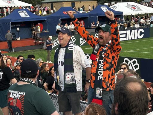 Platner campaigning with former Maine Senate president Troy Jackson, a Maine gubernatorial candidate in 2026, at a Portland Hearts of Pine match on September 27, 2025. Photo: MAINEiac4434. CC BY-SA 4.0.