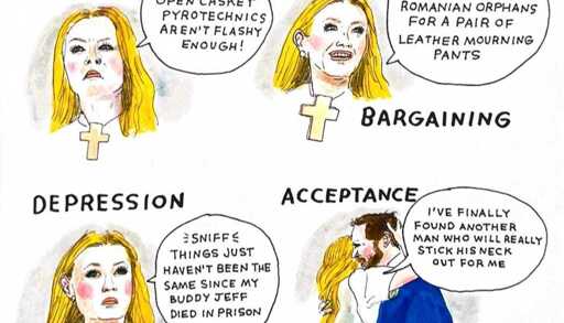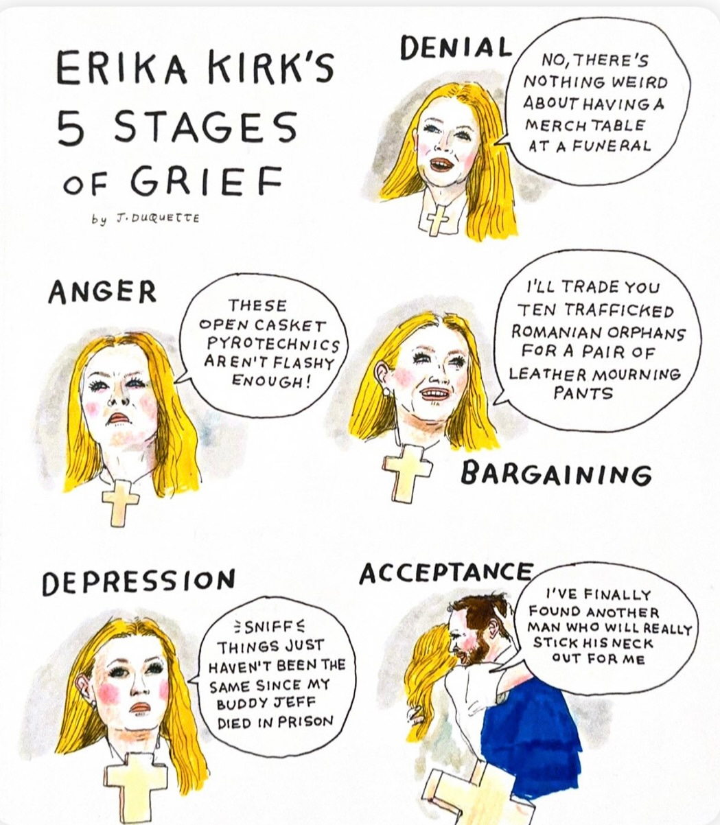 Erika Kirk fell off her (undeserved) pedestal this week after a too-close hug with JD Vance and that’s a win for all of us. Cartoon by the always amazing Jesse Duquette