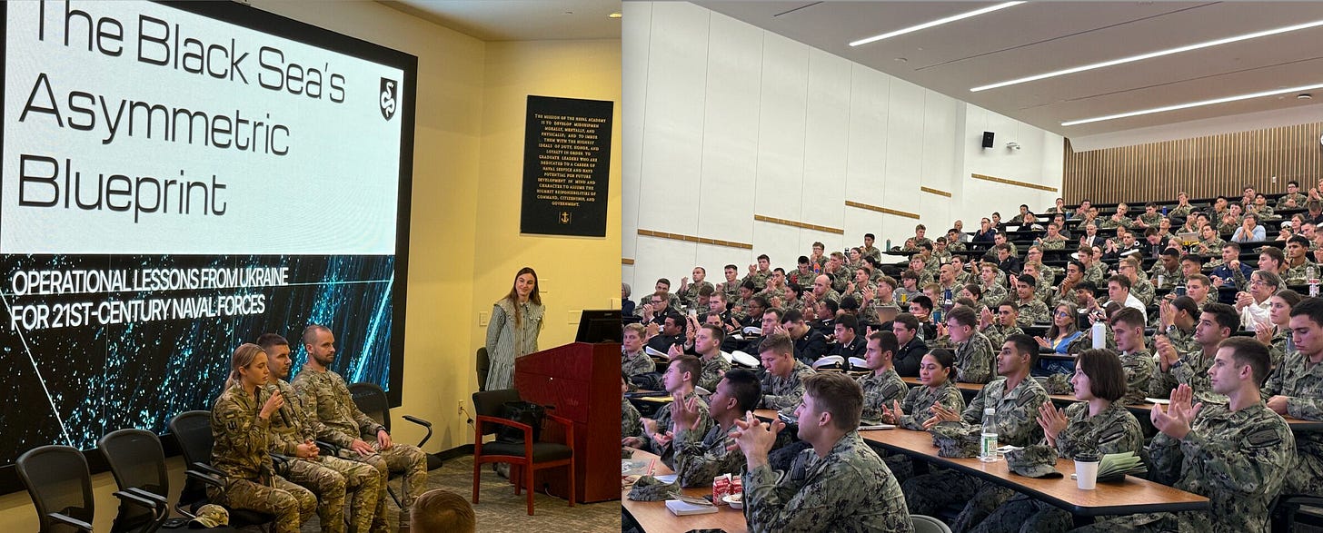 In early October, the SII delegation also lectured over 100 students at the U.S. Naval Academy in Maryland, and presented their latest report, “The Black Sea’s Asymmetric Blueprint: Operational Lessons from Ukraine for 21st-Century Naval Forces.” Michael Kuiper, the adjunct professor who hosted the event, said that Snake Island Institute “captivated” the audience. “As the lights dimmed and the presentation began, the air buzzed with anticipation; each Midshipman captivated by the real-life stories of bravery and strategy unfolding before them.”