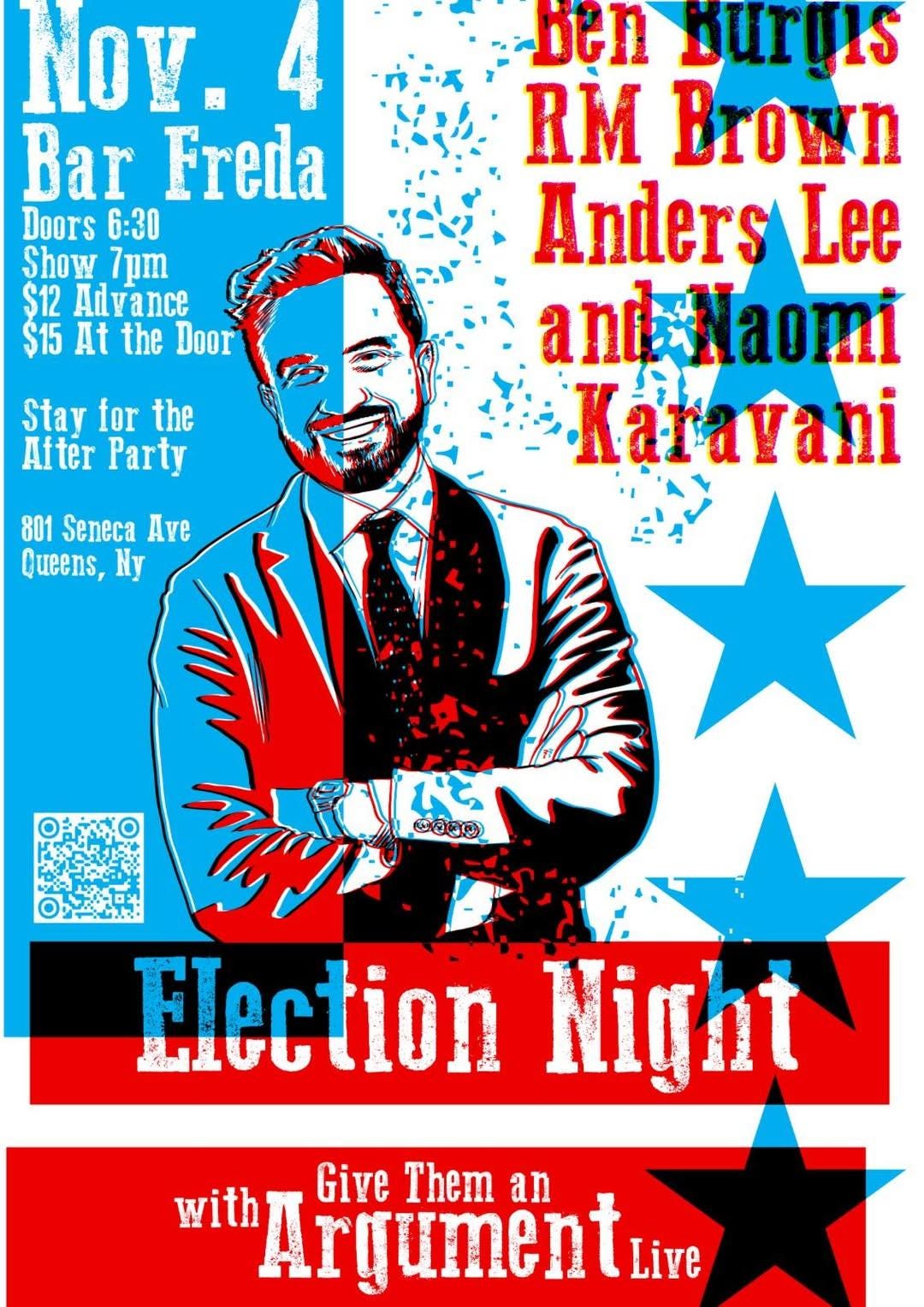 Tomorrow night at the performance space in the basement of Bar Freda in Queens, I’ll be doing a live podcast with RM Brown, Anders Lee, and Naomi Karavani to talk about the election, and then we’ll be doing what will with any luck be a straightforward “celebration party” not a “watch party” in the main bar area upstairs. If you want an advance ticket, you can pick those up here.